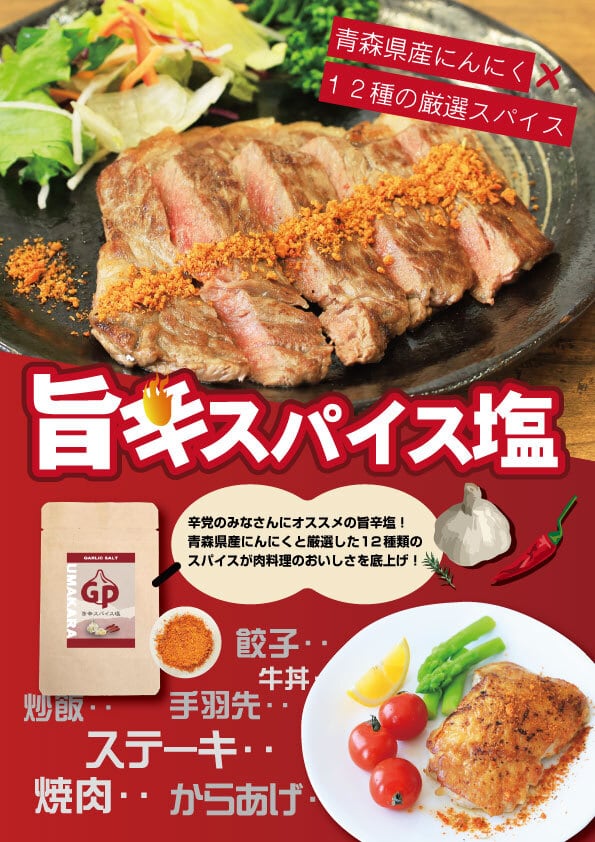 厳選した12種類のスパイスとにんにくを黄金比でブレンドした旨辛スパイス塩。
